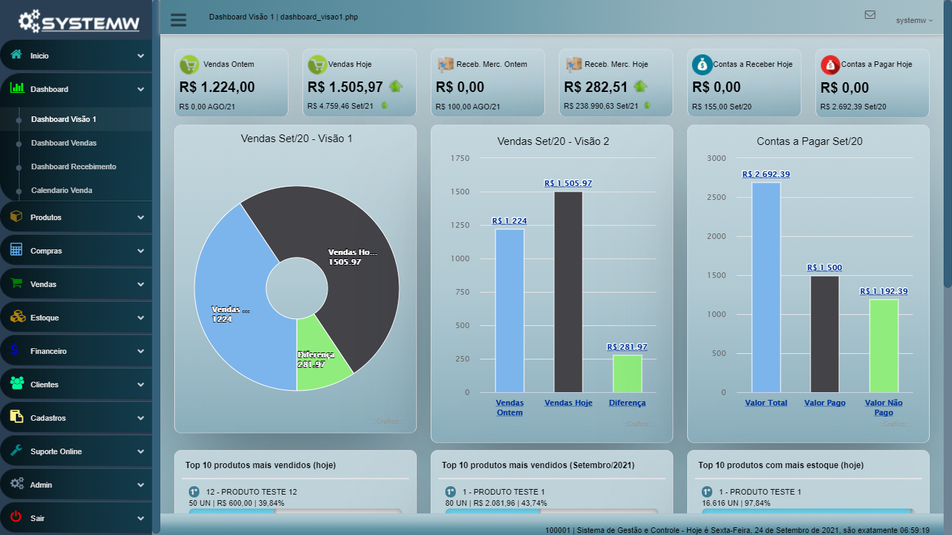 Mostra os 10 produtos mais vendidos, com mais estoque e muito mais.