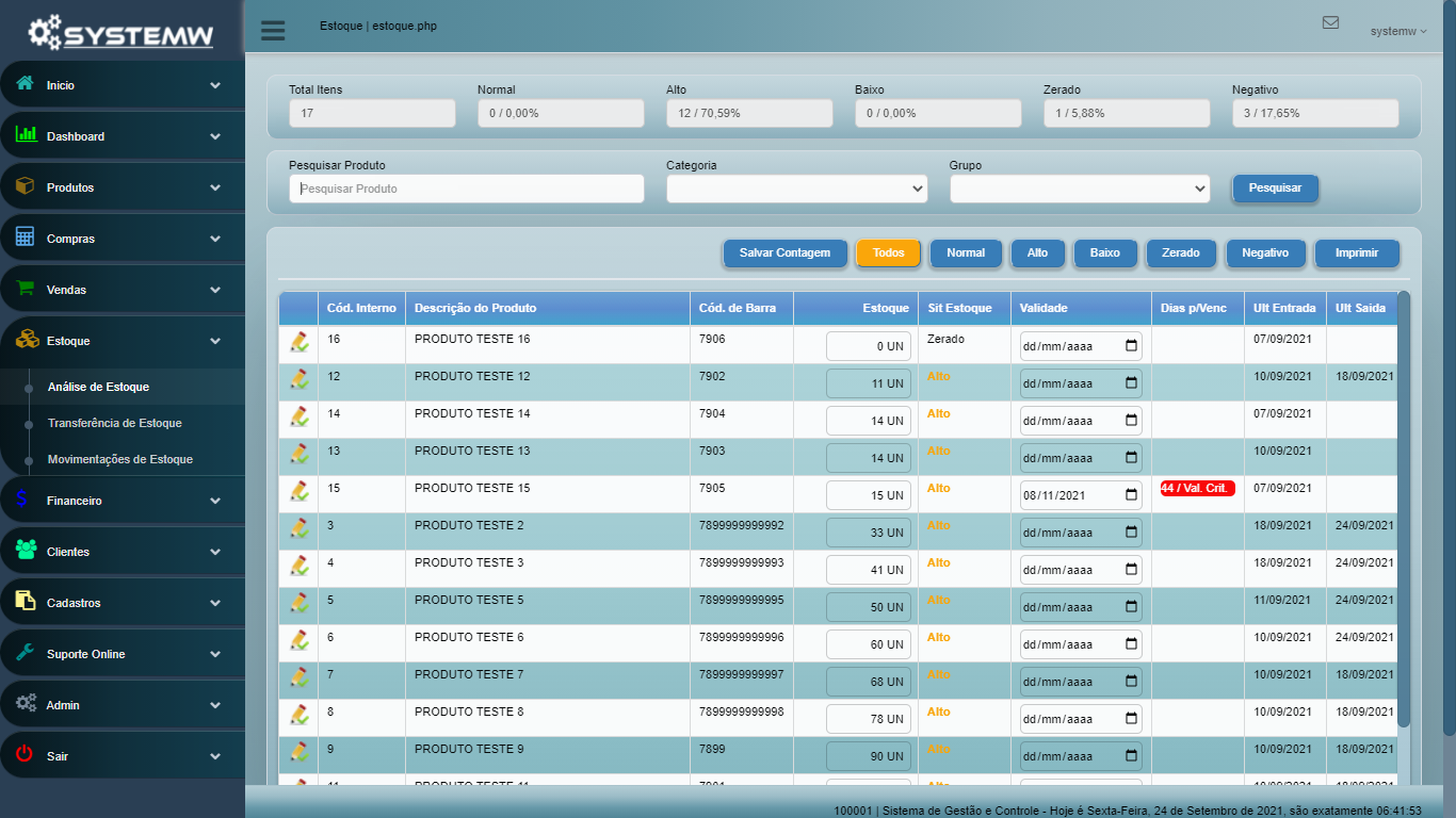 Nessa tela mostra todos os produtos e seu estoque, mostra a última entrada do produto no estoque, última saida do produto no estoque, dias do produto no estoque, dias para vencer...